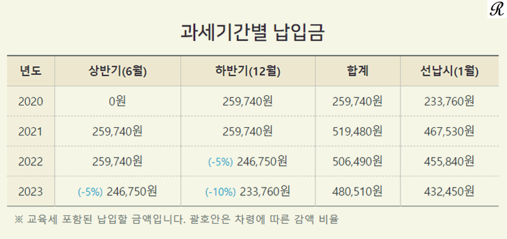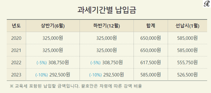 연간 기준세액 우측에는 과세기간별 납입금 또한 확인해 보실 수 있는데요. 여기서는 2020~2023년도까지의 상/하반기 금액, 합계금액, 선납시(1월) 금액 을 확인해 보실 수 있습니다.