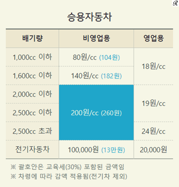 자동차세를 계산하기 위해서는 단순히 차종뿐 아니라 차종의 사용용도(비용업용 / 영업옹), 배기량, 최초등록일(상반기/하반기) 까지 고려해야되기 때문에 계산기를 사용하지 않고서는 생각보다 자동차세를 계산하는 것이 어려운데요.