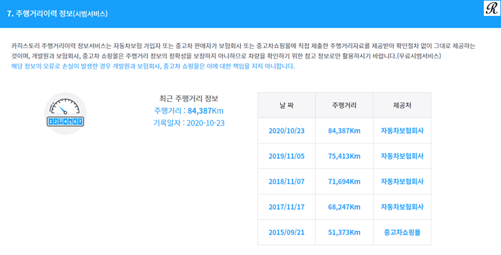 다음은 주행거리이력 정보도 확인이 가능합니다. 년도별 주행거리 및 제공처를 자세히 확인해 보실 수 있습니다.