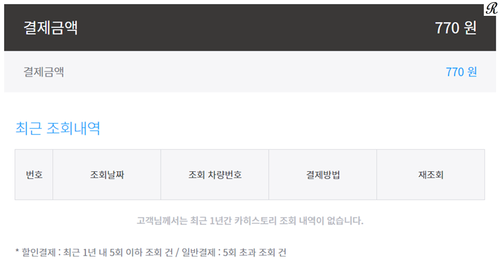 정상적인 차량번호라면 아래와 같이 "조회 가능한 차량입니다."라는 문구가 노출되며, 일반조회 및 할인조회 두 가지 기능을 이용해보실 수 있습니다. 두 가지 조회에 가격이 다르지만 일반적으로 업자가 아닌이상 1년에 5건 이상을 조회할 필요가 없기 때문에 저렴한 770원짜리 조회방법을 이용하시는 것을 추천 드립니다.