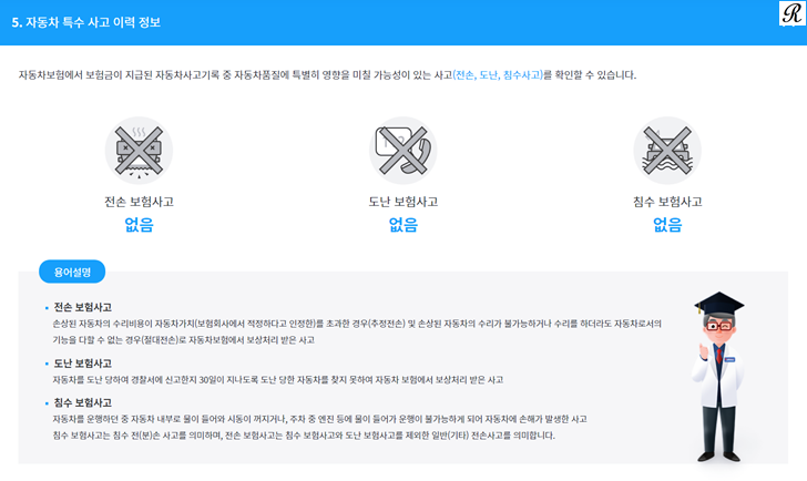 다음으로는 자동차 특수사고 이력 정보를 확인하실 수 있습니다. 여기서는 전손,도난,침수 보험사고 관련 이력을 확인해 보실 수 있습니다.