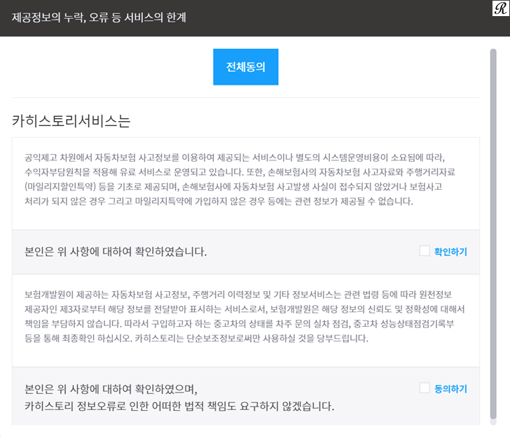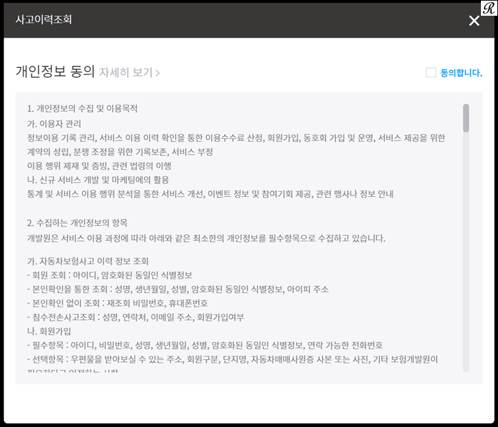 휴대폰 인증하기 버튼 선택 후 사고이력조회 관련 개인정보 동의를 한번 더 진행해 줍니다.