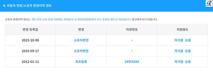 다음으로는 자동차 번호/소유자변경이력 정보를 확ㅇ인 가능합니다.