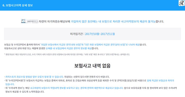 다은으로는 보험사고이력 상세 정보 내용을 확인하실 수 있습니다. 보홈이 미가입 된 시기똥안은 사고이력정보 제공이 불가하다고하는 참고해 보시길 바랍니다.