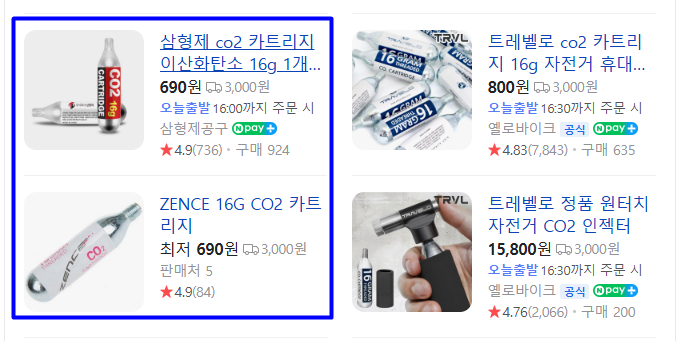 네이버에 자전거 Co2로 검색을 진행하시면 다양한 실린더가 노출되는데요. 이 중 16g짜리 아무 제품이나 구매하셔도 됩니다. 일반적으로 하나의 가격이 690원밖에 하지 않지만 배송비가 3000원이기 때문에 이왕 구매 시 넉넉하게 구매를 하시는 것을 추천드리는데요.
